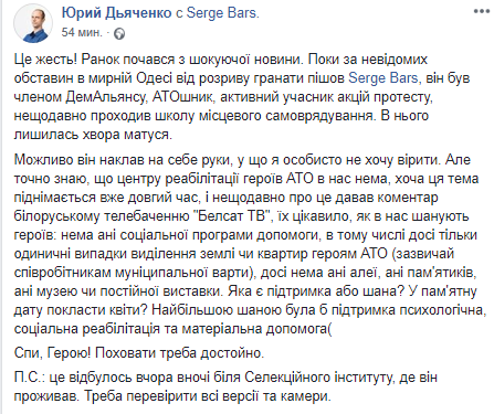 Поздно вечером 24 февраля в Одессе, в районе Селекционного института, в своей квартире на гранате подорвался бывший атошник и активист Сергей Барс. Об этом на своей странице в Facebook сообщил активист Юрий Дьяченко.