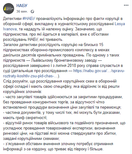 "Детективы НАБУ проанализируют информацию о фактах коррупции в оборонной сфере, изложенную в журналистском расследовании Леси Ивановой, и предоставят ей надлежащую оценку. Отметим, что предприятия, о которых идет речь в материале, уже являются объектами расследований НАБУ. В целом детективы расследуют коррупцию на около 15 предприятиях оборонно-промышленного комплекса в рамках нескольких десятков уголовных производств", - сказано в сообщении.