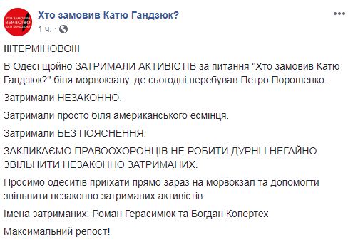 В Одессе поздно вечером 26 февраля задержаны активисты-расследователи Роман Герасимюк и Богдан Копертех за вопрос президенту Петру Порошенко "Кто заказал Катю Гандзюк?". Об этом группа с аналогичным названием сообщила в Facebook.