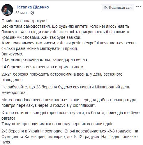 В ближайшие выходные, 2-3 марта, в Украине похолодает. Об этом синоптик Наталья Диденко написала на своей странице в Facebook.