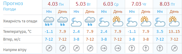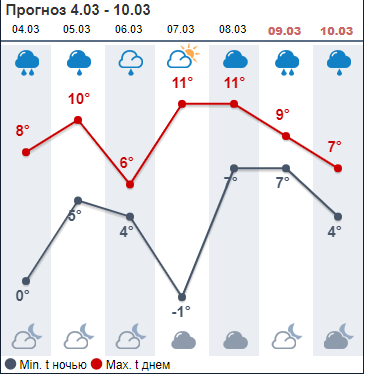 Ресурс Мeteoprog.ua обещает +8...+10 и дождь 4 и 5 марта. Среда, по данным этого ресурса, будет немного прохладнее, до +6 днем. В четверг-пятницу, 7 и 8 марта, потеплеет до +11, осадков не будет. Выходные будут мокрыми, дневная температура +7...+9.