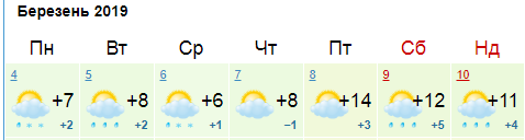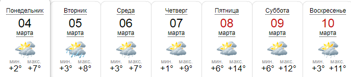 Сайт Укргидрометцентра обещает  до +7...+9 в начале недели. В понедельник-вторник возможен дождь. В пятницу, 8 марта, будет по весеннему тепло: до +13...+15. Переменная облачность без осадков.