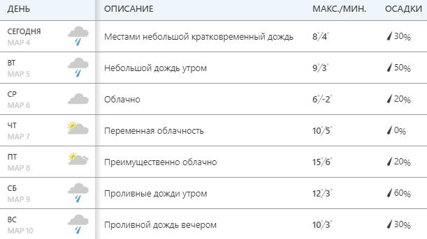 Сайт Weather.com также сообщает, что самым теплым днем недели станет 8 марта, когда воздух прогреется до +15. В остальные дни от +6 до +12. В понедельник-вторник - дождь. Выходные 9 и 10 марта также могут подпортить обильные осадки.
