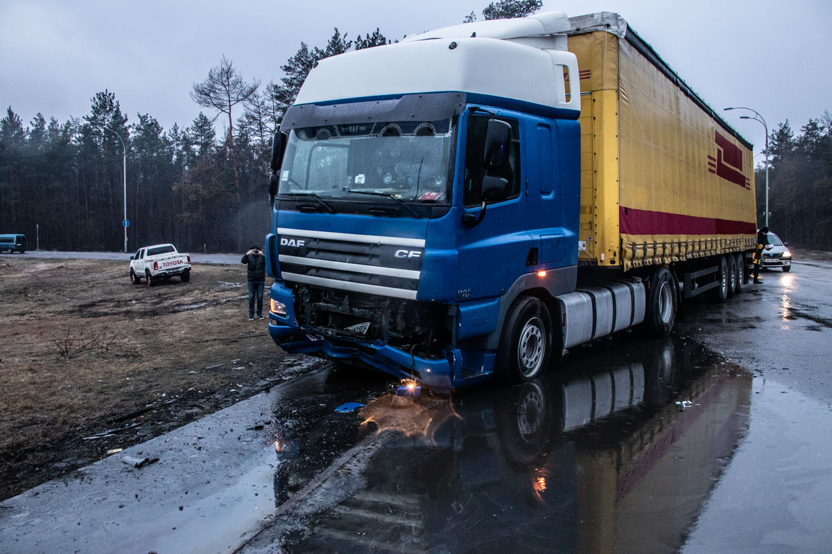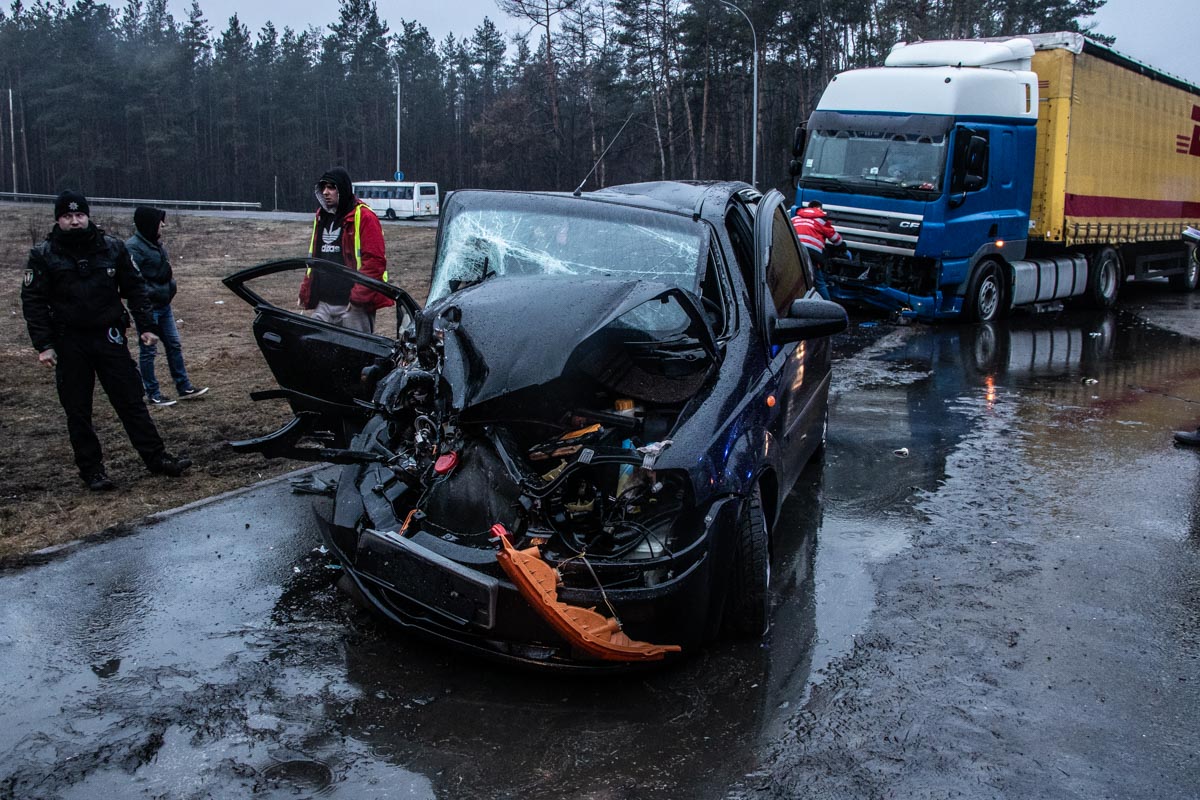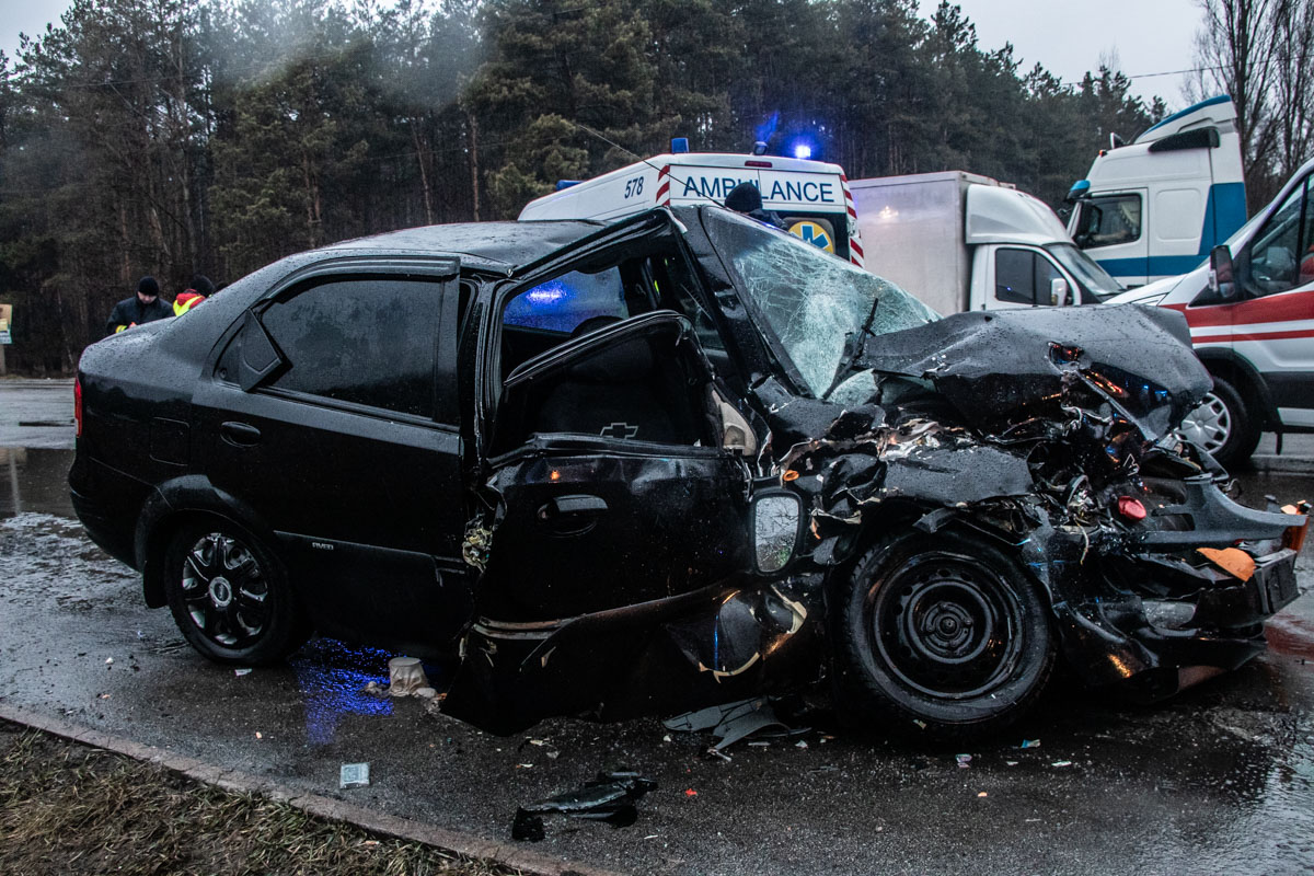 Авария произошла около 06:10 на развязке улиц Богатырской и Днепроводской. По предварительным данным, автомобиль Chevrolet Aveo двигался из Вышгорода в сторону Киева по улице Днепроводской. На развязке с Богатырской произошло лобовое столкновение легкового автомобиля с фурой DAF.