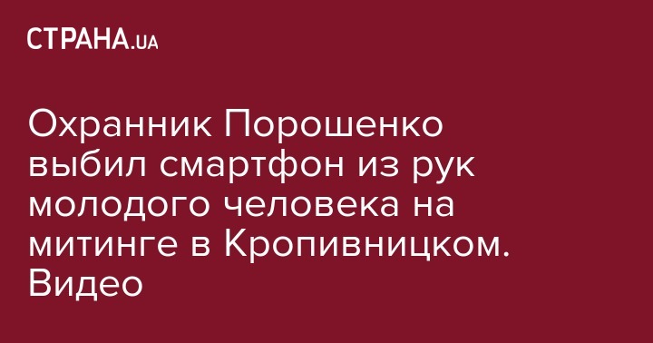 В сети опубликовали видеозапись, на которой охранник президента Петра Порошенко во время встречи с жителями Кропивницкого выбил из рук одного их молодых людей в толпе гаджет, которым он снимал главу государства. Запись была опубликована в YouTube на канале Татьяны Высоцкой.