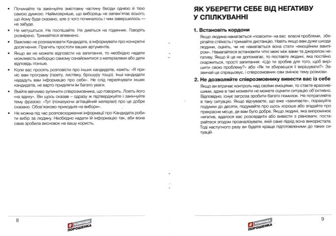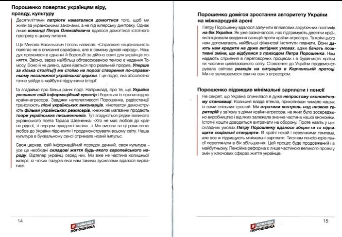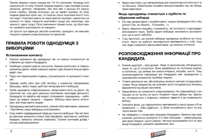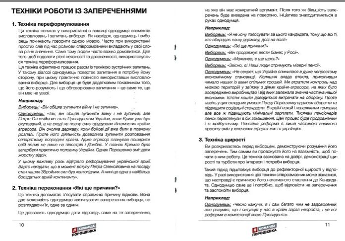 Авторы пособия называют агитаторов словом "единомышленники". В брошюре приводятся примеры тренировочных занятий с ними, а также варианты разговоров с избирателями. Основные темы – война на Донбассе, состояние экономики, пенсионная реформа, получение Украиной безвиза и томоса об автокефалии национальной православной церкви, обещание кандидата закрыть свой бизнес в России и т.д. Например, среди достижений Петра Порошенко, о которых нужно рассказать избирателям сказано, что "в планах Кремля было захватить почти половину Украины, но Порошенко смог дать жесткий отпор". Или, например, на вопрос о повышении тарифов нужно отвечать, что это были "необходимые меры для оздоровления ситуации в ЖКХ, которое десятилетиями страдало от деструктивной политики прошлых властей".