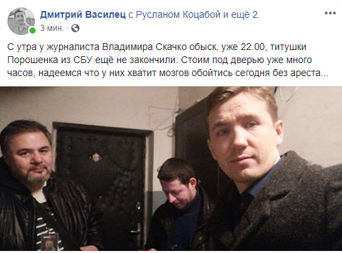 "С утра у журналиста Владимира Скачко обыск, уже 22.00, титушки Порошенка из СБУ ещё не закончили. Стоим под дверью уже много часов, надеемся что у них хватит мозгов обойтись сегодня без ареста", сообщил у себя в Facebook журналист Дмитрий Василец.