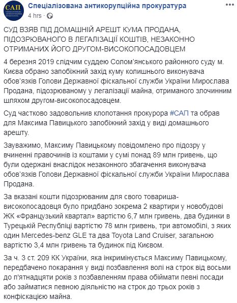 "4 марта 2019 года следственным судьей Соломенского районного суда г.Киева избрана мера пресечения куму бывшего исполняющего обязанности председателя Государственной фискальной службы Украины Мирослава Продана, подозреваемому в легализации имущества, полученного преступным путем другом-высокопоставленным чиновником", - говорится в сообщении.