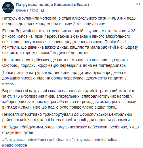Чуть позже патрульные установили, что ребенка родили в домашних условиях, на учете он не находится и документов на ребенка нет. Бориспольские патрульные составили на мужчину административный материал по ст. 178 (распитие пива, алкогольных, слабоалкогольных напитков в запрещенных законом местах или появление в общественных местах в пьяном виде) КоАП. О событии сообщили в отдел полиции. Ребенка госпитализировали в Бориспольскую центральную детскую больницу в отделение интенсивной терапии.