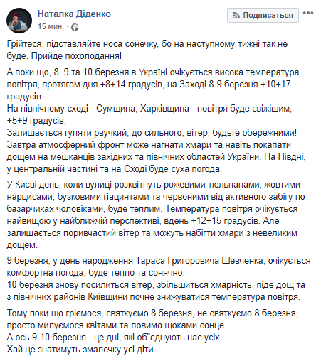 "В Киеве день, когда улицы расцветут розовыми тюльпанами, желтыми нарциссами, сиреневыми гиацинтами и красными от активного забега по базарчикам мужчинами, будет теплым. Температура воздуха ожидается самой высокой в ближайшей перспективе: днем +12...+15 градусов. Но остается порывистый ветер, и могут набежать облака с небольшим дождем", - написала Наталья Диденко.