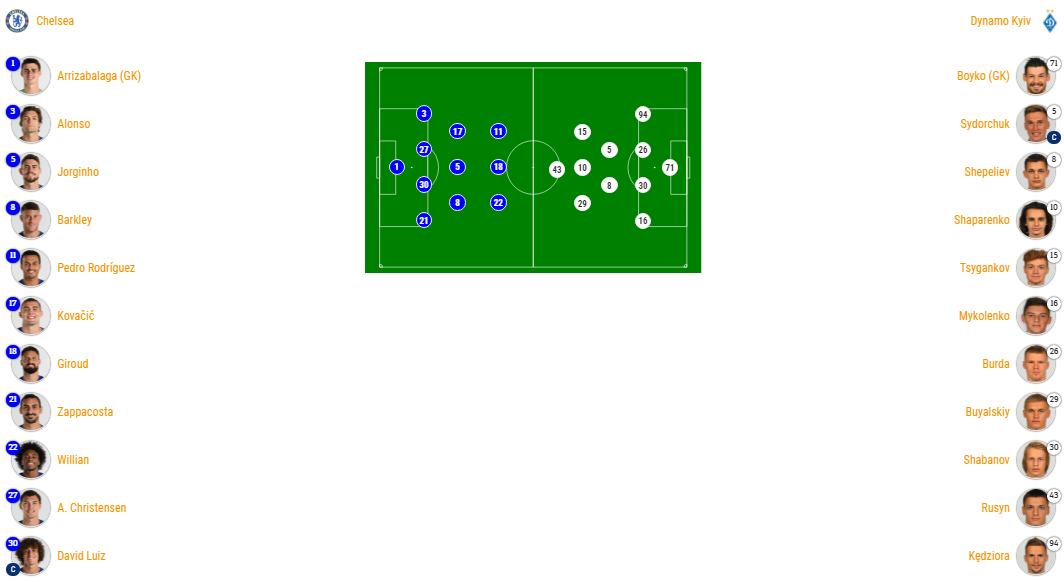 Челси: Кепа - защита Дзаппакоста, Кристенсен, Давид Луис, Алонсо - полузащита Баркли, Жоржиньо, Ковачич - атака Педро, Жиру, Виллиан.