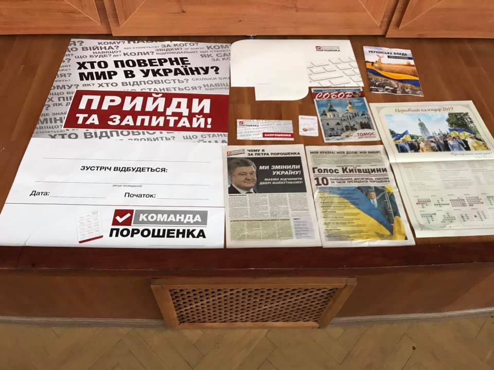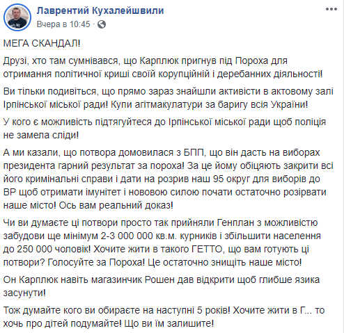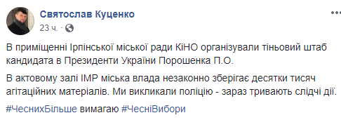 "В помещении Ирпенского городского совета организовали теневой штаб кандидата в Президенты Украины Порошенко П. А. В актовом зале горсовета городские власти незаконно хранят десятки тысяч агитационных материалов. Мы вызвали полицию - сейчас проводятся следственные действия", - отметил Куценко.