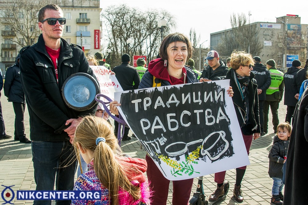8 марта в Запорожье был проведен митинг под лозунгом "Женщина – не кухонный комбайн". Как передает местное издание 061.ua, мероприятие состоялось на площади возле библиотеки. Местные жители пришли на акции вместе с кухонными приборами, вениками и плакатами "Феминизм или варварство", "Поплакала и стоп? Женщины – не фиалки", "Я тоже могу готовить", "Цветы – клумбам, права – женщинам", "Нет кухонному насилию", "Мужчины не боятся равенства" и другими.