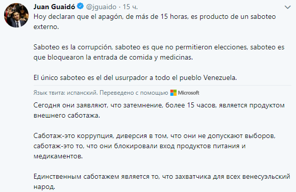В свою очередь, Гуайдо предположил, что во всем виноваты сами власти: "Саботаж заключается в коррупции, в невозможности провести выборы, в блокировке ввоза продуктов питания и лекарств в страну. Весь саботаж проводится узурпатором, и страдает от этого весь народ Венесуэлы".