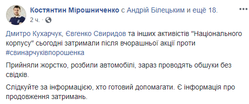 Националист Константин Мирошниченко в Facebook отметил, что на данный момент полиция проводит обыски по месту жительства задержанных.