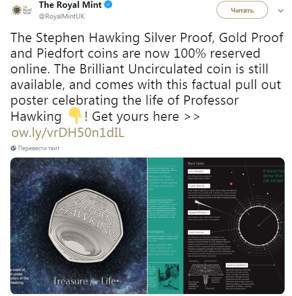 Монеты с черной дырой выпущены в исполнении из разных сплавов и стоят от 10 до 795 фунтов (в золоте). Весь тираж монет уже зарезервирован.