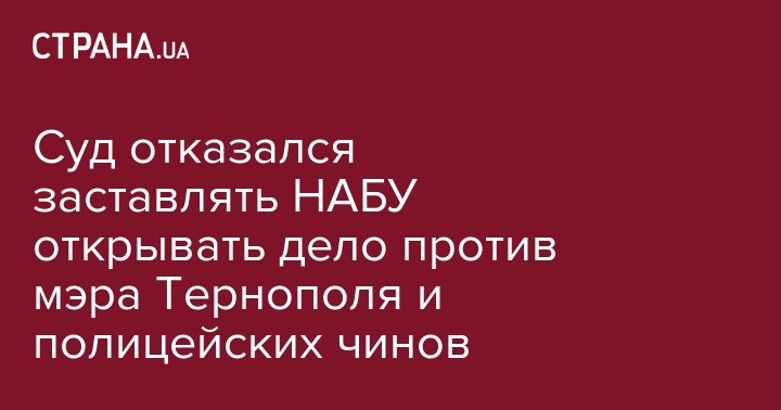 Но 19 февраля суд принял решение, которым отказался обязать НАБУ открывать уголовное производство. Суд мотивировал это тем, что истец не предоставил в заявлении достаточных объективных данных и конкретных фактов, которые могут свидетельствовать о совершении мэром Тернополя и чинами полиции уголовных правонарушений.