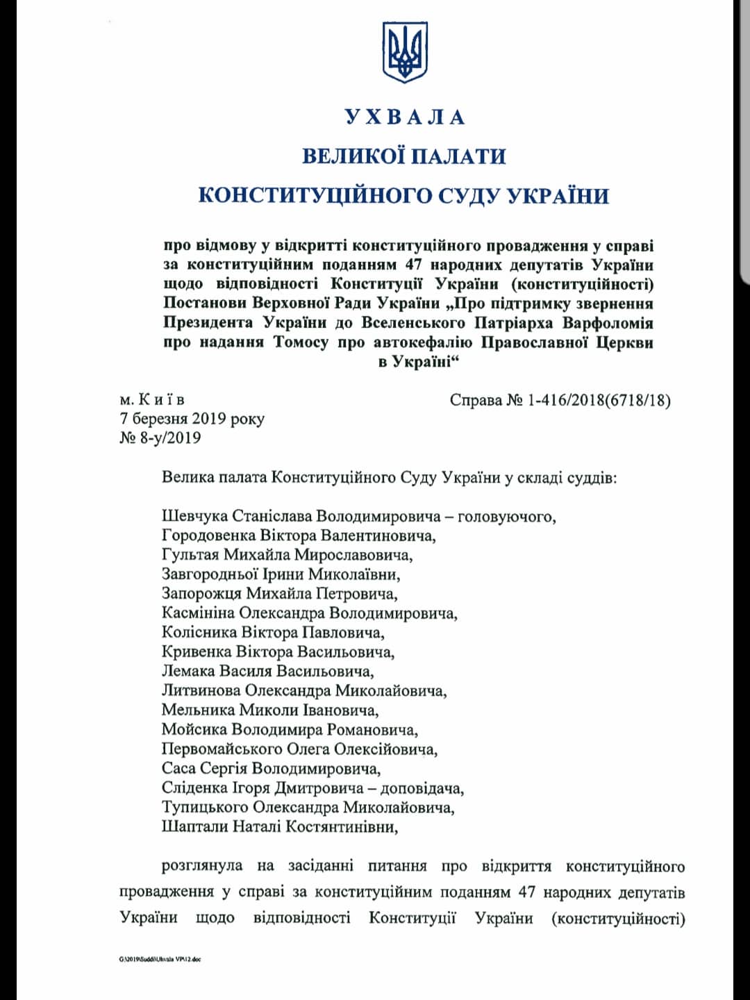 Ранее, в декабре-2018, 47 народных депутатов Украины обратились в Конституционный суд с просьбой признать противоречащим Конституции постановление Верховной Рады в поддержку Томоса, в котором, по их мнению, был нарушен принцип разделения государства и церкви.
