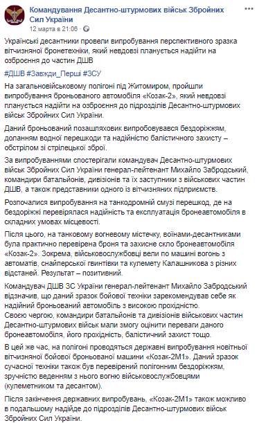 На общевойсковом полигоне под Житомиром прошли испытания бронированного автомобиля "Казак-2", который вскоре планируют передать на вооружение подразделений Десантно-штурмовых войск Вооруженных сил Украины. Об этом сообщает командование ДШВ на своей странице в соцсети.