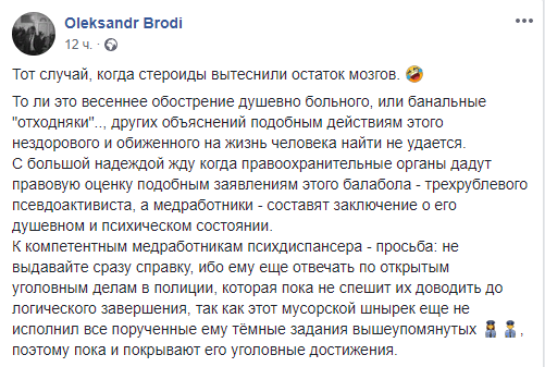 Позже на его сообщение отреагировал сам "исполнитель" заказа Александр Броди. Председатель "Антикоррупции" назвал Рахимова психически нездоровым человеком, у которого "стероиды вытеснили остаток мозгов", и списал все на "весеннее обострение душевно больного, или банальный "отходняк". Кроме того, он понадеялся, что правоохранительные органы дадут правовую оценку подобным заявлениям "балабола".