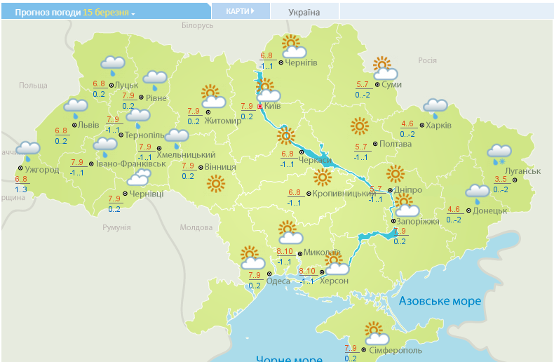 В воскресенье, 17 марта, по прогнозу синоптика погода в Украине улучшится - будет сухо и потеплеет до +10...+15 градусов, на западе до +14...+20 градусов.