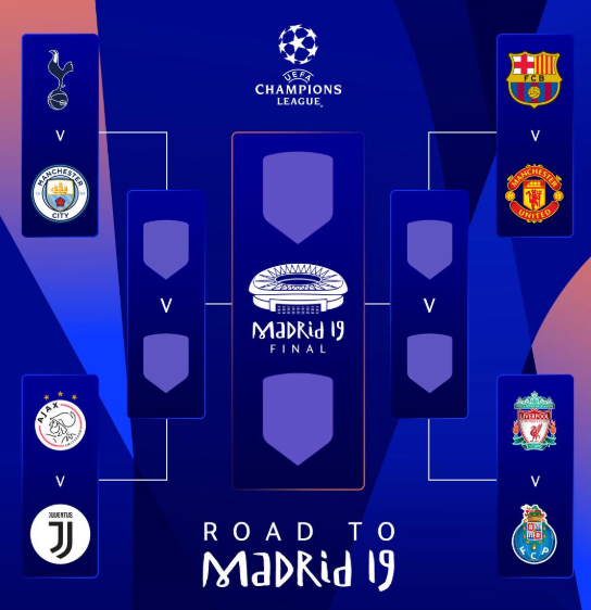 В полуфиналах сыграют победители пары Тоттенхэм - Манчестер Сити и Аякс - Ювентус и пары Барселона - Манчестер Юнайтед и Ливерпуль - Порту.