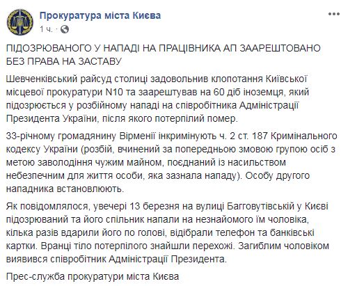 Шевченковский районный суд столицы сегодня, 15 марта, удовлетворил ходатайство прокуратуры Киева и арестовал на 2 месяца гражданина Армении, подозреваемого в нападении на сотрудника Администрации президента Александра Бухтатого, который позже скончался. Об этом в Facebook сообщает прокуратура Киева.