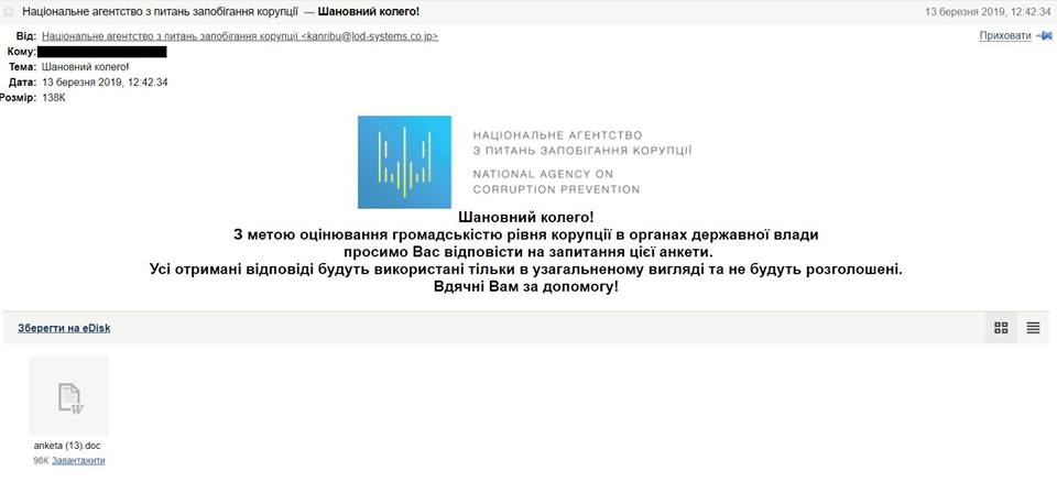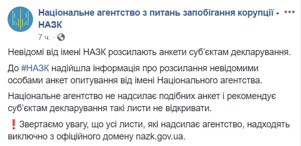 "В НАПК поступила информация о рассылке неизвестными лицами анкет опроса от имени Национального агентства. Национальное агентство не шлет подобные анкеты и рекомендует субъектам декларирования такие письма не открывать", - сообщается на странице НАПК в соцсети Facebook.