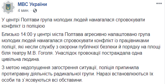 15:01 В Полтаве, у театра, где сегодня выступал Порошенко, не обошлось без столкновений. О стычке сообщила полиция. В ходе драки пострадал один гражданский, но пока никто не задержан.