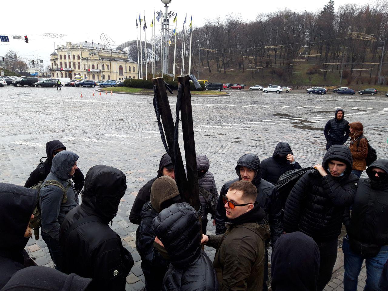 13:36 Часть националистов двинулись по Крещатику к Европейской площади - под Администрацию президента. Туда несут огромную рогатку.