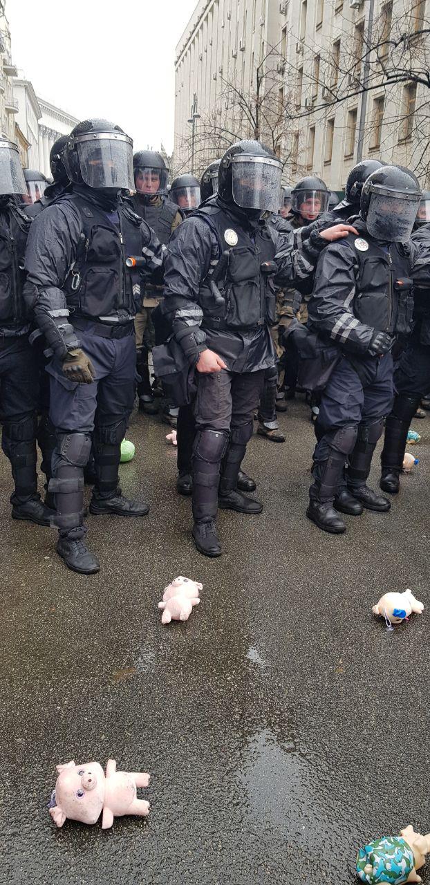 14:03 На акции всем желающим раздали игрушечных поросят, которые поют песенку о "розовых хрюшках". Некоторые зачем-то забросали животными офис партии 5.10 Геннадия Балашова. Напомним, что Свинарчук - первая фамилия Олега Гладковского, против которого идет митинг.
