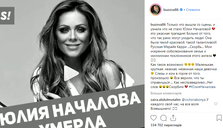 Актриса Эвелина Бледанс тоже выразила соболезнования в связи со смертью Началовой. "Юленька, милая моя девочка! Спасибо за свет, которым ты освещала всё вокруг себя! Прощай, лучезарная красавица! Царствие небесное", - написала она в Instagram.