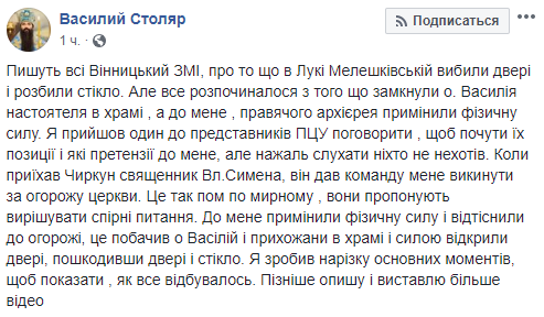 Как сообщает архиерей УПЦ Василий Столяр, конфликт начался с физической атаки, а также после того, как в храме заперли настоятеля - отца Василия. "Я один пришел к представителям ПЦУ, чтобы поговорить и услышать их позиции и претензии ко мне, но, к сожалению, слушать никто не хотел. Когда приехал Чиркун, священник владыки Симена, он дал команду меня выбросить за ограду церкви. Это так по-мирному, они предлагают решать спорные вопросы. Ко мне применили физическую силу и оттеснили к забору, это увидел и отец Василий, и прихожане в храме, и силой открыли дверь, повредив двери и стекло. Я сделал нарезку основных моментов, чтобы показать, как все происходило. Позже опишу и выставлю больше видео", - заявил церковнослужитель.