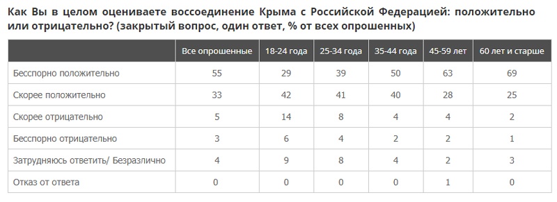 Уточняется, что наибольшее число приверженцев "воссоединения" среди людей старше 60 лет. 94% опрошенных в этой категории высказались за аннексию.