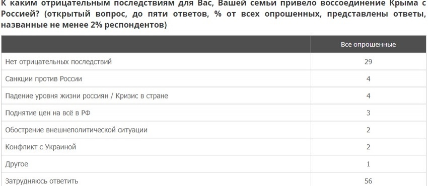 Отрицательные последствия для страны в виде санкций, обострения внешнеполитической ситуации и конфликта с Украиной отметили 8% респондентов.