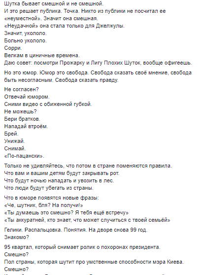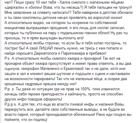 Он заявил, что двое ведущих унизили шестерых человек (фамилии которых были перечислены в шутке) на тусовке, у них за спиной. И привел полный текст шутки: "а теперь минута жалости для тех, кого с нами нет, да и вообще в свадебном бизнесе ...помните как они раньше вставали в 6 утра и ехали на объект, давайте вспомним эти лица и их имена: Дергоусова, Городецкий, Дядя Жора, Джеджула, Матвиенко, Ермилова".