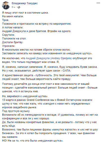 18 марта Такудис написал на своей странице в Facebook, что на него напали "трое братков", среди которых был Андрей Джеджула. По его словам, предварительно ему позвонили и пригласили на мероприятие, а на месте его скрутили, угрожали и выбрили несколько клочков волос бритвой. А также заставили записать на камеру его извинения за шутку.