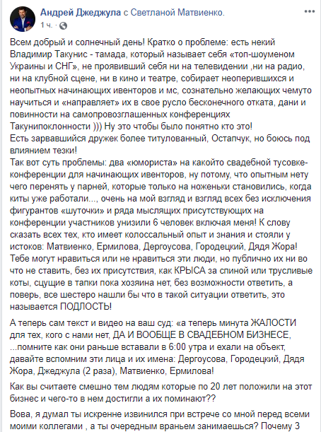 Свою версию конфликта обнародовал Андрей Джеджула, который назвал Владимира Такудиса не проявившим себя ни на телевидении, ни на радио, ни на клубной сцене, ни в кино человеком, который собирает начинающий ивенторов и мс на самопровозглашенных конференциях. Владимира Остапчука, который был ведущим на сцене, Джеджула назвал более титулованным зарвавшимся дружком Владимира Такудиса.