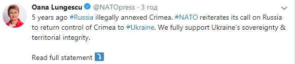 В НАТО попросили Россию вернуть Украине контроль над аннексированным Крымом. В блоке выразили озабоченность нарушением прав человека на полуострове со стороны властей по отношению к украинцам, крымским татарам и другим местным сообществам.