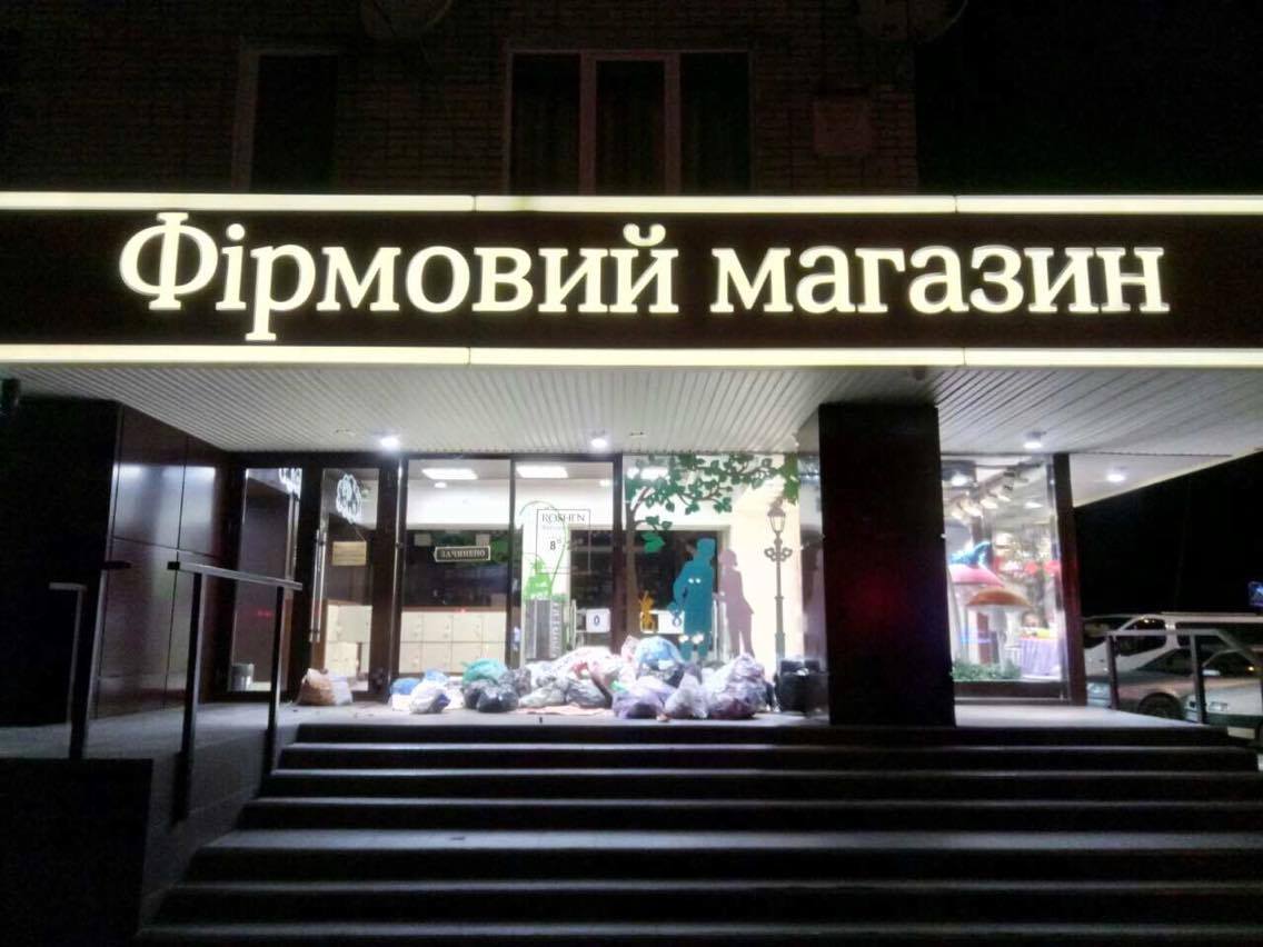 Магазины Порошенко не в первый раз подвергаются атакам. Их не только жгли, но и разрисовывали, устраивали оппозиционные перфомансы и блокировали вход.