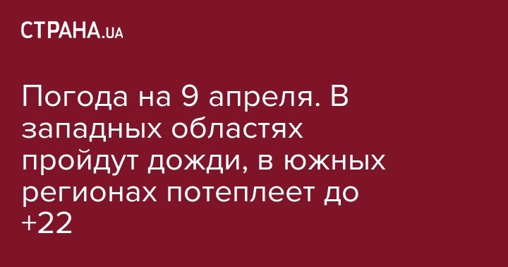 Во вторник, 9 апреля, в Украине по-прежнему будет по-весеннему тепло, в некоторых регионах возможны небольшие дожди. Об этом свидетельствует прогноз, размещенный на сайте Укргидрометцентра.