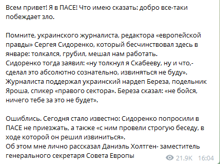"Сегодня стало известно: Сидоренко попросили в ПАСЕ не приезжать, а также "с ним провели строгую беседу, в ходе которой он решил извиниться", - написала она.