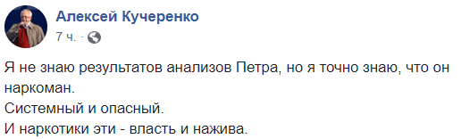 "Я не знаю результатов анализов Петра, но я точно знаю, что он наркоман. Системный и опасный. И наркотики эти - власть и нажива", - пишет эксперт по вопросам ЖКХ Алексей Кучеренко.
