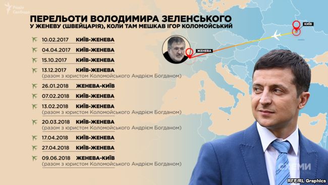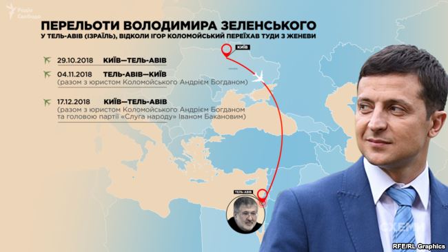 За два последних года Владимир Зеленский по меньшей мере 11 раз летал в Женеву, когда там проживал олигарх Игорь Коломойский, а после его переезда в Израиль летом 2018-го Зеленский два раза прилетал в Тель-Авив.