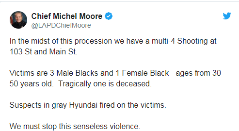 "Во время процессии прогремела стрельба на перекрестке 103 St и Main St. Жертвами являются три чернокожих мужчины и одна чернокожая женщина в возрасте от 30 до 50 лет. Один скончался. Подозреваемые в сером Hyundai обстреляли пострадавших. Мы должны остановить это бессмысленное насилие", - написал шеф городской полиции Мишель Мур.