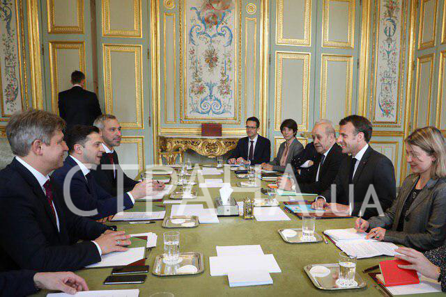 Около 15:00 началась встреча с президентом Франции. Справа от Зеленского - экс-министр финансов Александр Данилюк, слева - бывший замминистра юстиции Украины Руслан Рябошапка.
