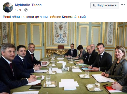 После встречи президента Франции Эммануэля Макрона и кандидата в президенты Украины Владимира Зеленского в Париже пользователи соцсетей обсуждают их совместное фото из кабинета в Елисейском дворце, придумывая подписи к нему. На фото слева от шоумена находился экс-заместитель министра юстиции Украины Руслан Рябошапка, а справа бывший министр финансов Александр Данилюк. Как уже писала "Страна", оба они являются советниками Зеленского.