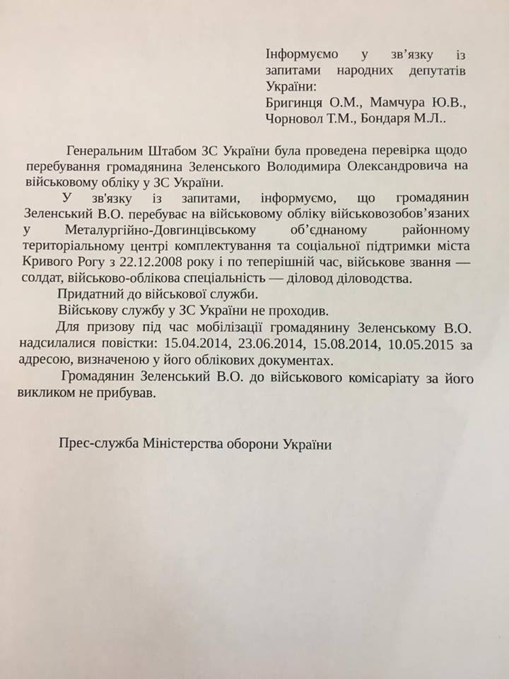 "Гражданин Зеленский В.А. находится на воинском учете военнообязанных в Металлургическо-Долгинцевском объединенном районном территориальном центре комплектования и социальной поддержки Кривого Рога с 22.12.2008 года и по настоящее время, воинское звание - солдат, военно-учетная специальность - делопроизводитель делопроизводства. Годен к военной службе. Военную службу в ВС Украины не проходил", - говорится в сообщении.