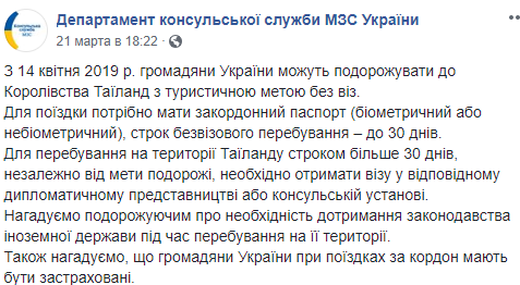 С сегодня, 14 апреля украинцы могут путешествовать в Таиланд с туристической целью без виз. Об этом в Facebook сообщает Департамент консульской службы МИД Украины.