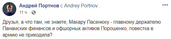 "Друзья, а что там, не знаете, Макару Пасенюку - главному держателю Панамских финансов и офшорных активов Порошенко, повестка в армию не приходила?", - поинтересовался он.